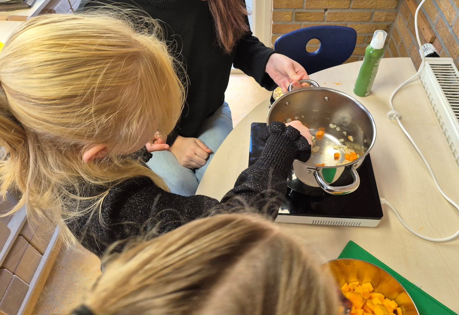 Deze week hebben we pompoensoep gemaakt in de klas. De kinderen vroegen hier al een tijdje om en waren dus ook erg enthousiast om te beginnen. Het begon met het schoonmaken van de pompoen. Dit was wel even een klusje want hij was vrij groot en er zaten veel pitjes in. Na het schoonmaken was het tijd om te snijden. Er werd pompoen, wortel, paprika en tomaat gesneden. Nadat alles gesneden was wogen we alles af op de weegschaal en konden we beginnen met het echte koken. De kinderen mochten helpen met het roeren in de pan en het toevoegen van alle ingrediënten. Tijdens het brood eten konden ze genieten van de eigen gemaakte soep met een stuk stokbrood. De meeste kinderen vonden het erg lekker! De bovenbouw mocht daarna ook nog komen proeven en smulden van de soep.