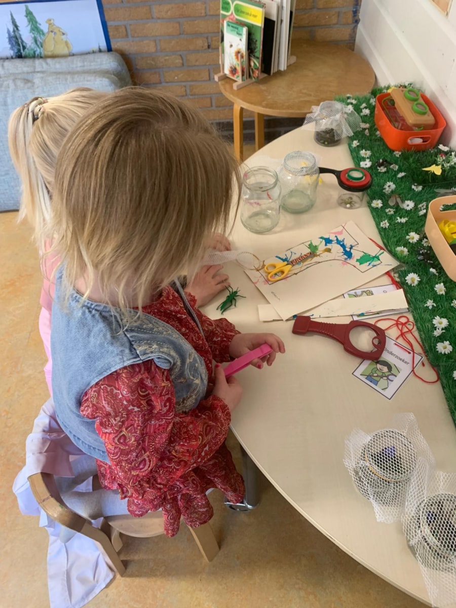 In de vlindertuin wordt er fanatiek gespeeld. Er is zelfs ‘personeel’ dat zorgt voor de kaartverkoop én voor de vlinders. Zo maken de kinderen bijvoorbeeld nectar voor de nepbloemen. Mooi om te zien hoeveel fantasie en betrokkenheid er is.