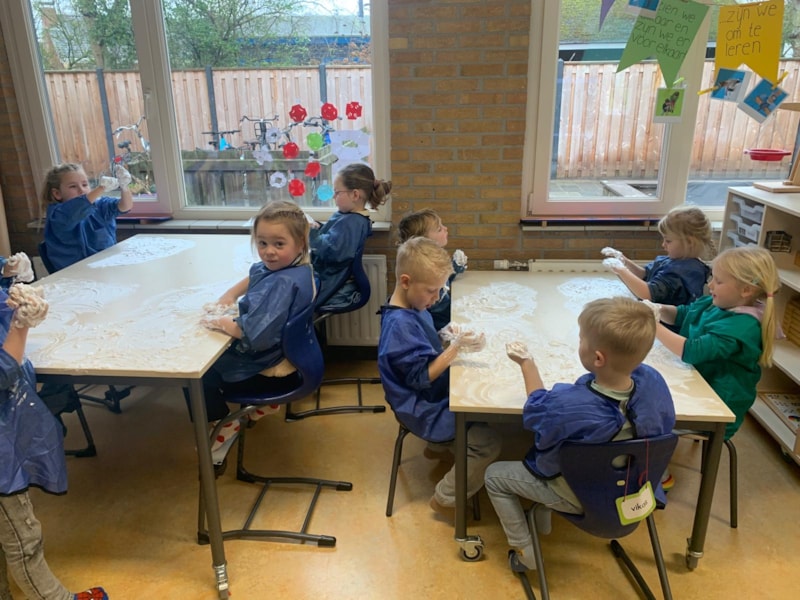 We beginnen de dag in de kring. Samen bespreken we welke dag het is en wat we die dag gaan doen. Daarna mogen de kinderen spelen in de hoeken. Ze mogen zelf kiezen wat ze hier willen doen. Tijdens de speel-/werktijd kan er voor verschillende ontwikkelingsgerichte activiteiten gekozen worden zoals puzzelen, schilderen, rollenspel in de hoeken en construeren in de bouwhoek. De kinderen kiezen met behulp van het digikeuzebord zelf in welke hoek ze willen spelen en werken. De kinderen spelen elke ochtend na de kleine pauze langer buiten. Ze maken hierbij gebruik van de materialen uit de schuur en van het verkeersplein. Het is ook fijn om op het plein onderzoek te doen naar alle bloemen, planten en dieren die er leven. De kinderen genieten hiervan. Bij goed weer doen we ook graag sommige lessen buiten